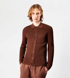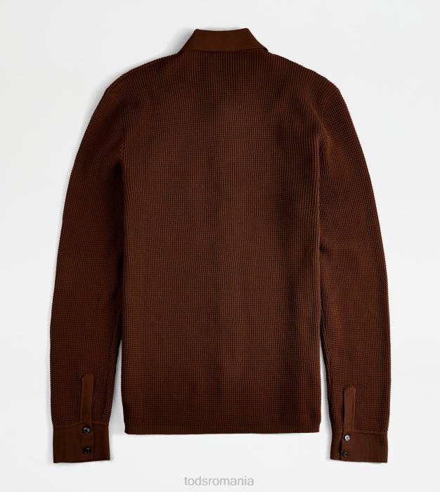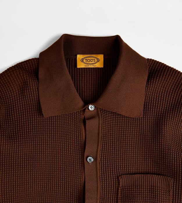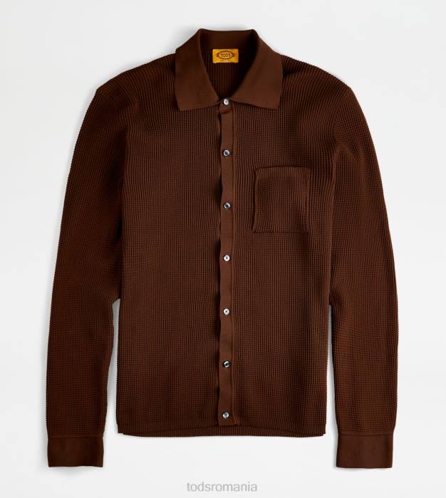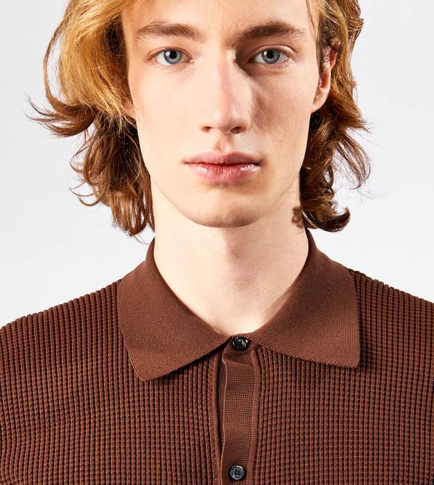 cămașă din tricot de nailon cu aspect tehnic, cu un detaliu original care amintește de textura de vafe. prevazuta cu un buzunar la piept, se inchide cu nasturi marcati cu efect sidef.