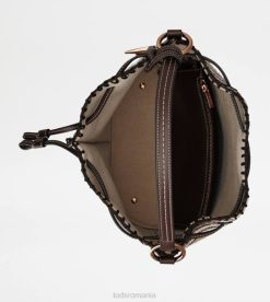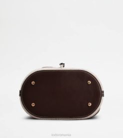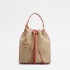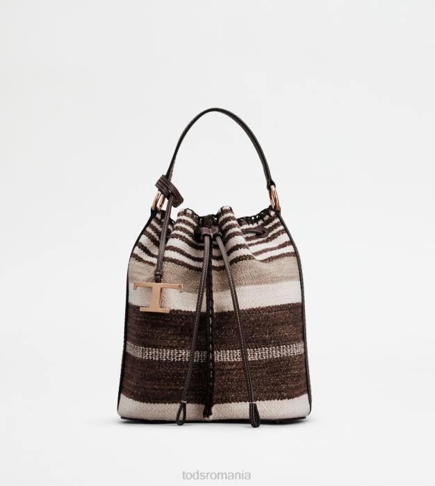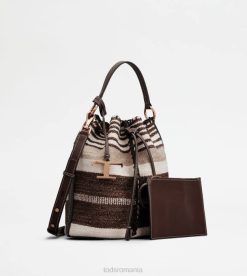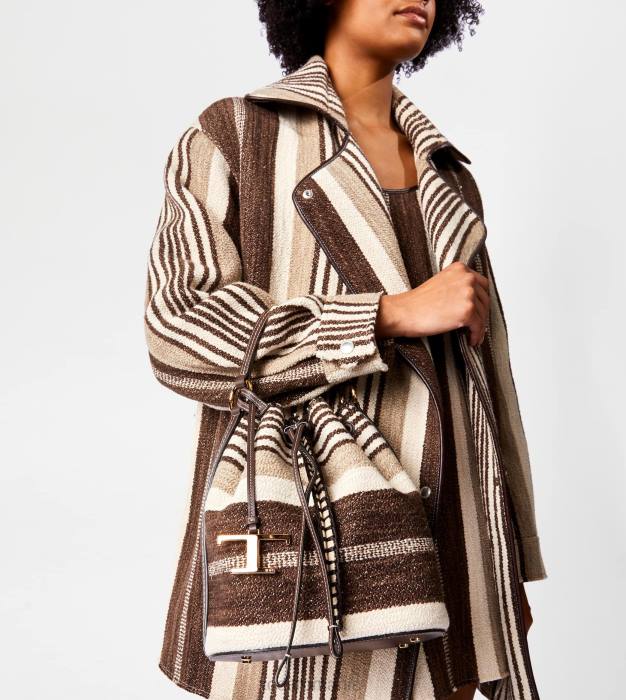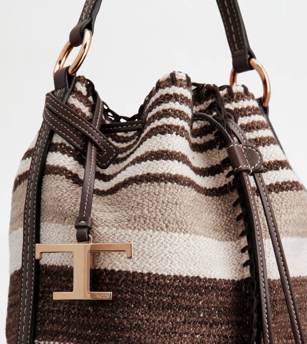 geantă găleată din țesătură boucle cu dungi, cu cusături pe țesătură și pandantiv atemporal din metal marcat. inchis cu un cordon practic, vine cu maner plat si curea de umar detasabila din piele. o creație sofisticată cu gust artizanal, cu picioare marcate și husă interioară din piele.