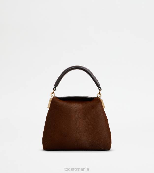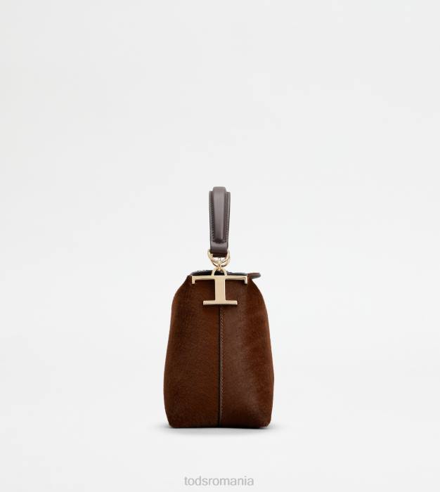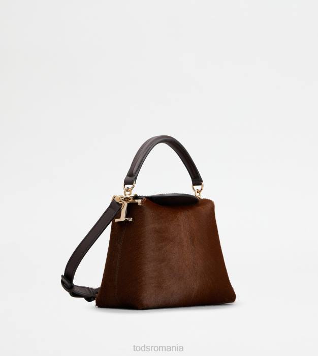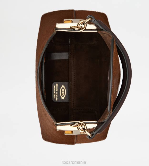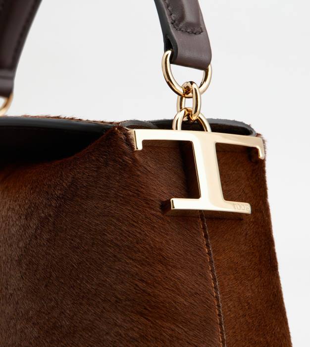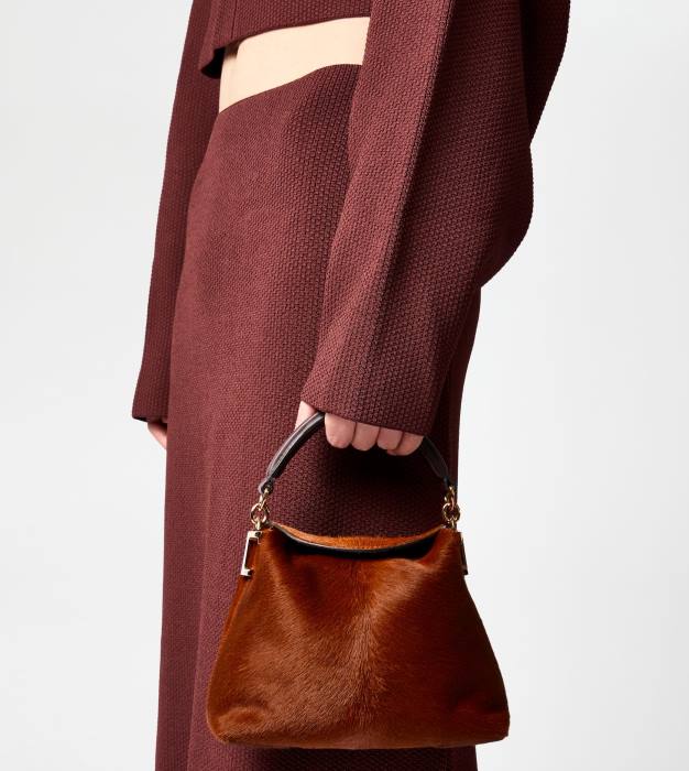 elementul distinctiv al acestei genți tip messenger este închiderea originală, realizată prin suprapunerea a două clapete în formă. Fabricat din piele cu efect de piele de ponei, are un mâner fix și o curea de umăr detașabilă din piele naturală. accesoriul metal t atemporal împodobește partea laterală a acestei creații de linie esențială și feminină.
