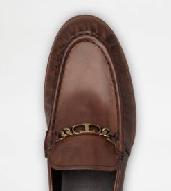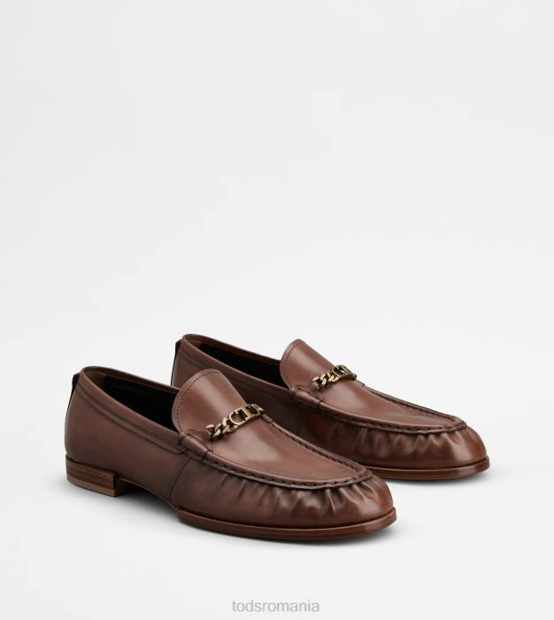 mocasini din piele fină periată, cu aplecare pe vârf și accesoriu de lanț metalic. caracterizate printr-o talpă din piele cu toc în formă de potcoavă, sunt un stil versatil, cu o eleganță informală.