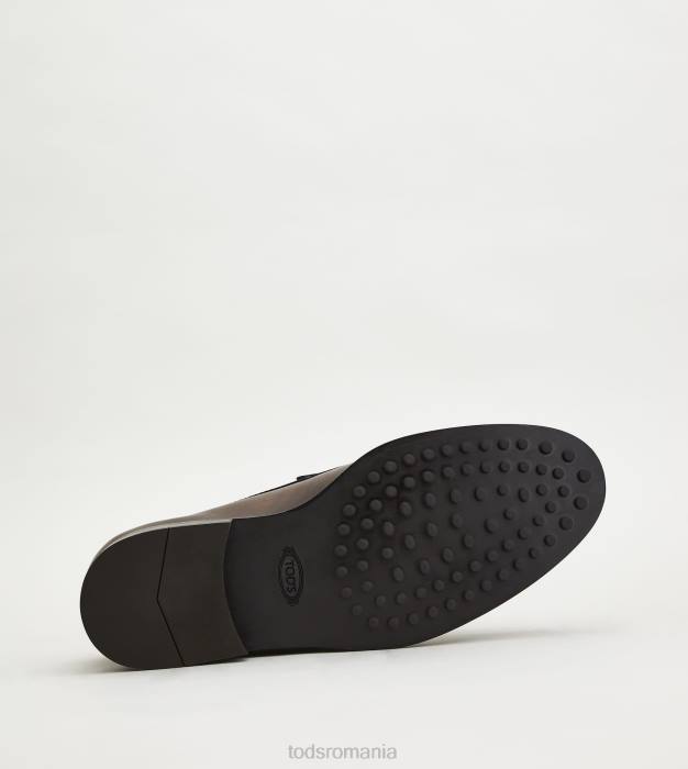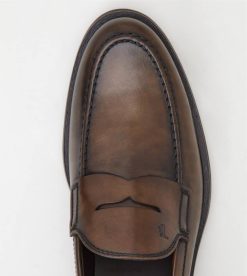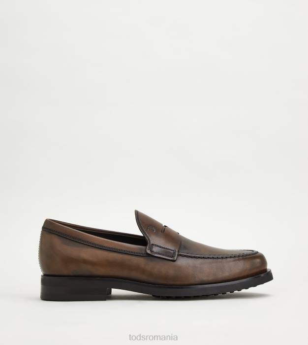 mocasini din piele anticata semilucioasa cu penny bar, monograma tod’s imprimata si talpa exterioara din cauciuc cu pietricele in relief.