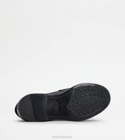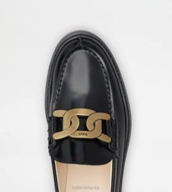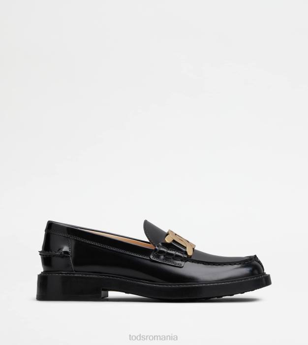 mocasini din piele cu finisaj lucios, accesoriu de lant metalic de marca, cusaturi expuse manual si talpa exterioara din cauciuc cu pietricele de cauciuc in relief.