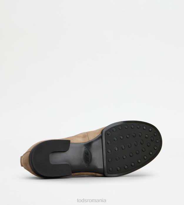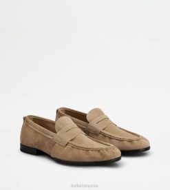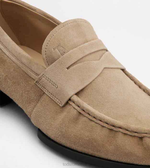 mocasini din piele intoarsa bogata cu efect usor uzat, penny bar, incretire pe varf, monograma tod’s imprimata, talpa exterioara din cauciuc cu pietricele de cauciuc in relief si toc in forma de potcoava.