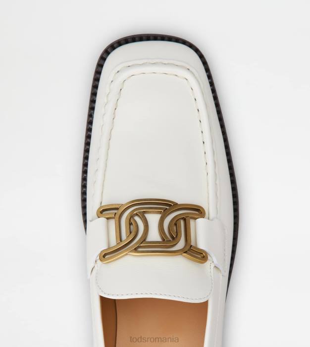 mocasini din piele netedă cu vârf pătrat și accesoriu de lanț metalic. avand talpa exterioara din cauciuc cu pietricele de cauciuc in relief, reluate de detaliile de pe toc, acestea interpreteaza o eleganta casual si atemporala.