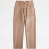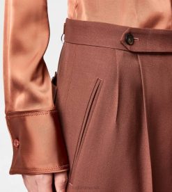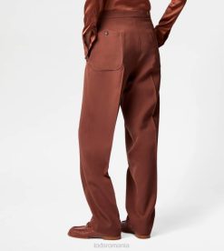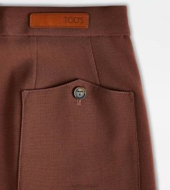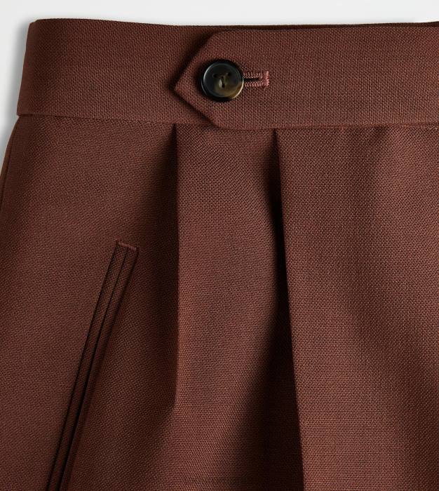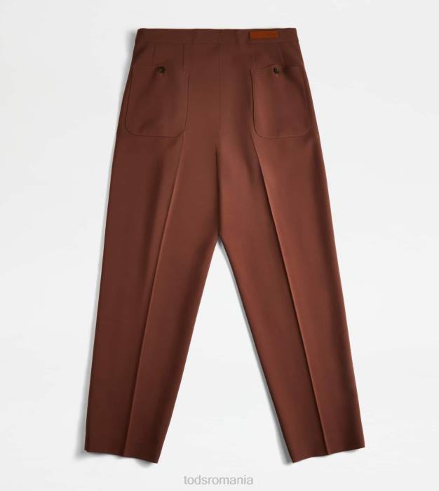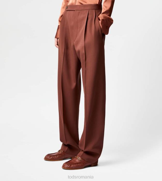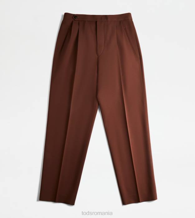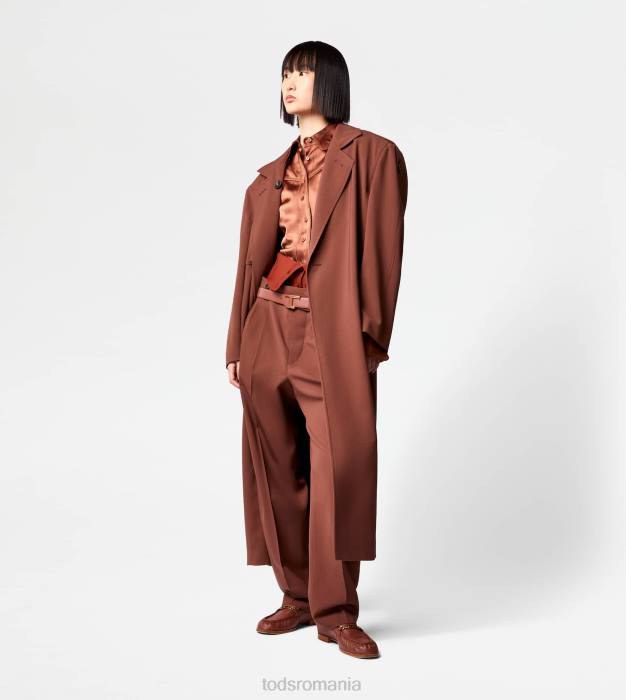 pantaloni din lână cu săgeți și cută călcată. Dispunând de buzunare frontale duble, acestea sunt dotate cu buzunare plasate la spate, cu ornamente în formă și nasture cu cusături în T. prinsă cu nasturi ascunși, haina vine cu eticheta tod’s din piele aplicată pe spate.
