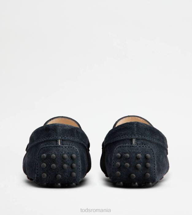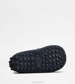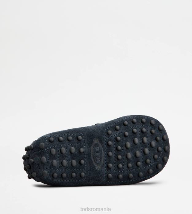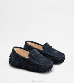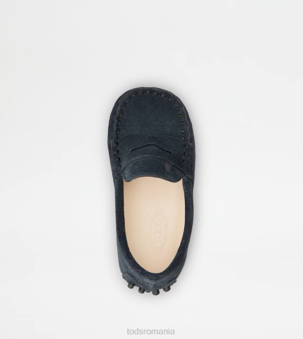 tod’s junior gommino din piele intoarsa, cu cusaturi de mana expuse, penny bar, monograma Tod’s imprimata la cald si emblematica talpa exterioara de pietricele de cauciuc.