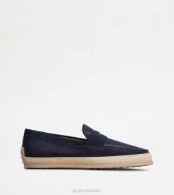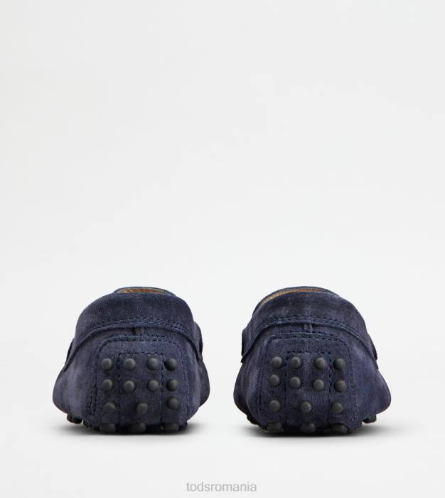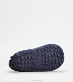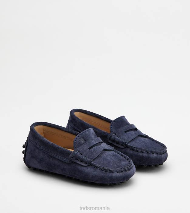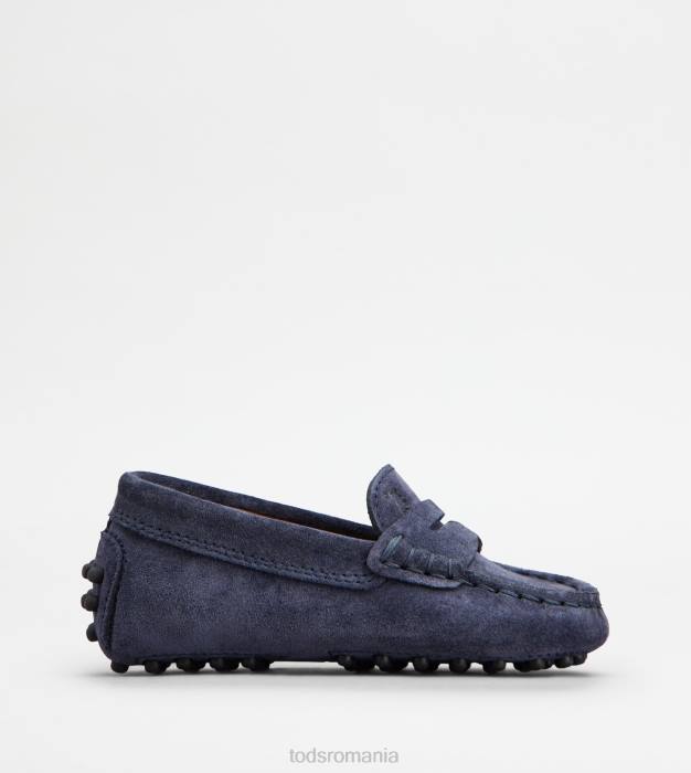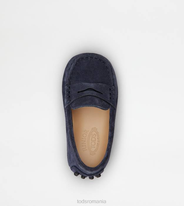 tod’s junior gommino din piele intoarsa, cu cusaturi de mana expuse, penny bar, monograma Tod’s imprimata la cald si emblematica talpa exterioara de pietricele de cauciuc.