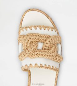 sandale plate din piele moale cu accesoriu de lant crosetat si talpa exterioara din cauciuc cu garnitura din rafie. rezultat al unui meșteșug atent, sunt o creație ușoară șic, care adaugă o notă iconică și rafinată look-ului tău de vară.