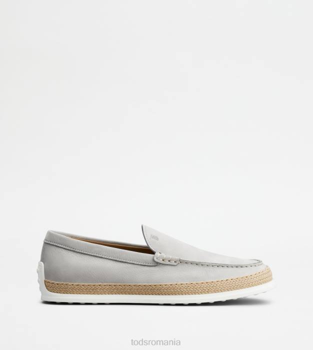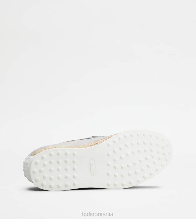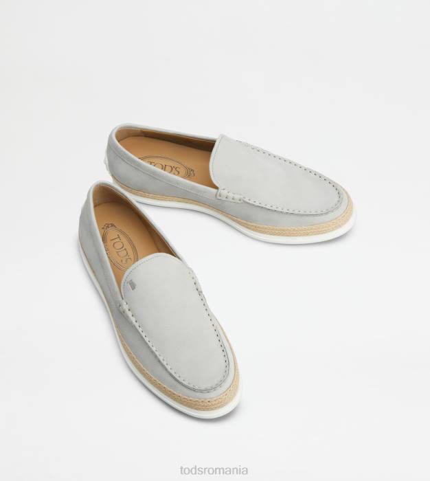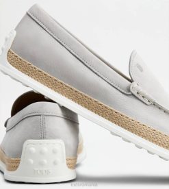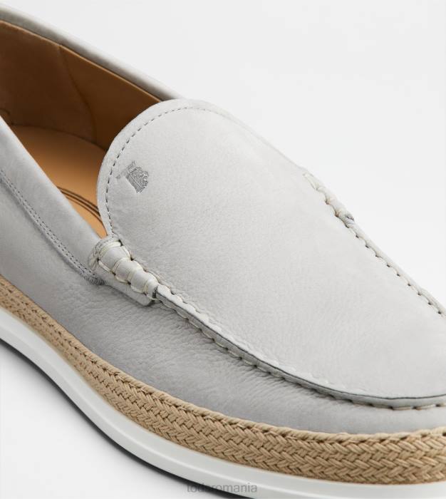 slip-on din nubuc mătăsos, cu monogramă Tod’s ștampilată și cusături expuse. talpă exterioară din cauciuc cu pietricele de cauciuc în relief și țesătură artizanală din rafie.