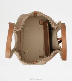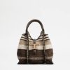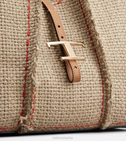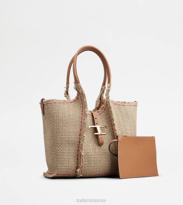 geantă de cumpărături cu linii fluide, realizată din țesătură boucle în dungi, cu bordură cu franjuri evidențiate prin cusături. prezentând pandantivul atemporal metal t marca emblematică, vine cu două mânere din piele. o creație contemporană cu un gust artizanal sofisticat, completată cu o husă interioară din piele.
