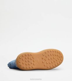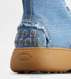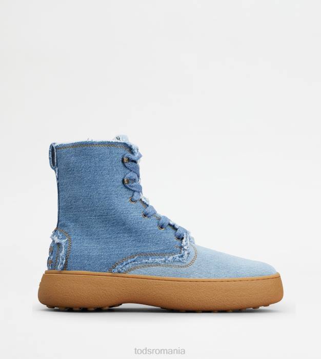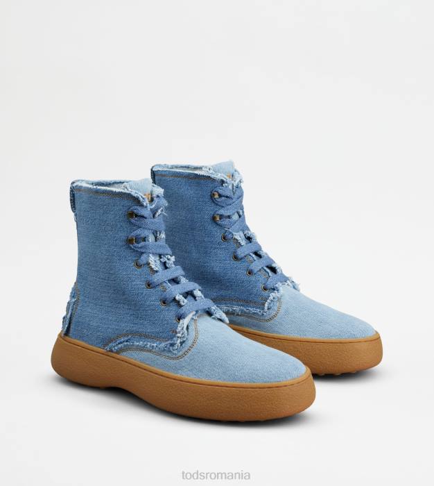 caracterizată printr-o talpă groasă, dar în același timp sobră și rafinată, tod’s w. g. stilul este propus aici într-o variantă de botine cu șireturi. confecționate din denim proaspăt, cu bordură cu franjuri, vin cu pietricelele de cauciuc distinctive pe fund și pe toc.